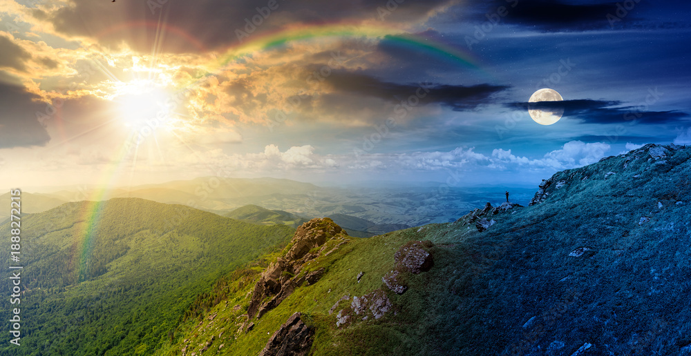 summer solstice mountain landscape. day and night time change concept. rocks on edge of hill with sun and moon at twilight. view in to valley. grassy slope under cloudy sky. distant ridge on horizon #1888272215