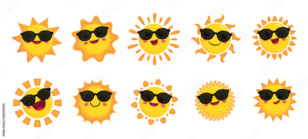 Sun face sunglasses clipart set. Yellow sun drawing characters wearing sunglasses clip art collection in cool and happy facial expression vector illustration. #1242316438
