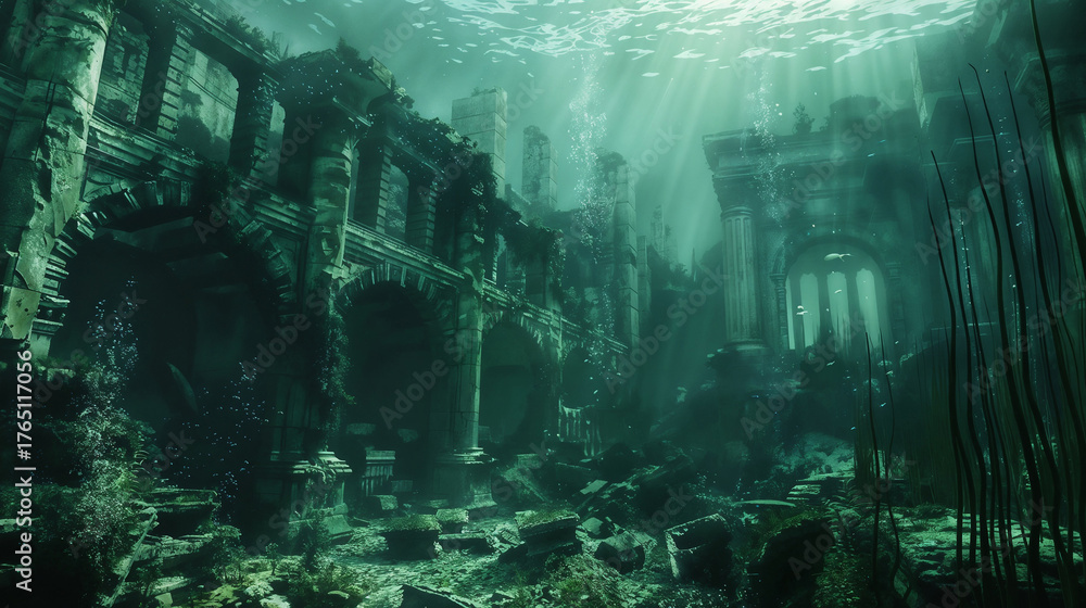 Sunken ancient city of Atlantis under ocean with greenish light filtering through ruins, evoking mythic lost civilizations, environmental disaster, and forgotten human legacy. #1765117056
