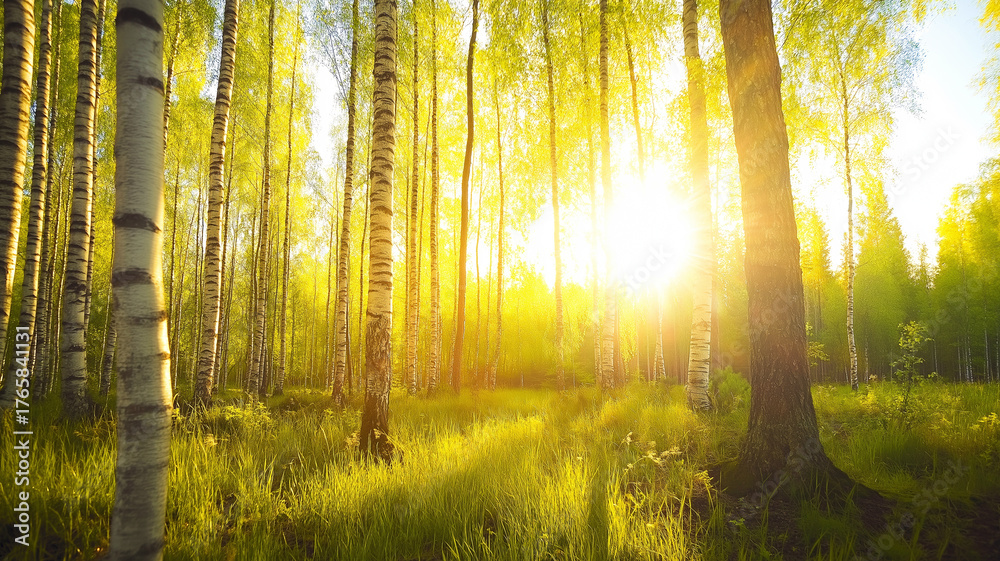 Sunlight illuminating a birch grove, vibrant green leaves and grass creating a feeling of renewal and natural beauty #1765841131