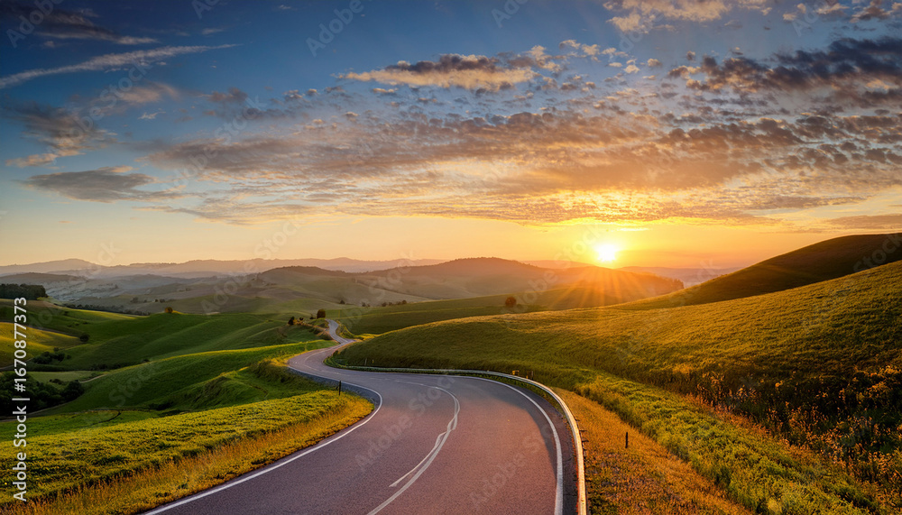 sunrise journey a winding road disappears into a vibrant sunrise over rolling hills symbolizing a path towards new beginnings and endless possibilities #1670877373