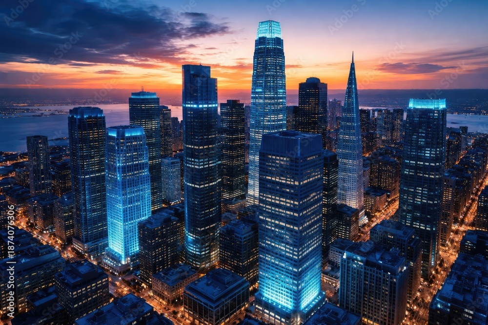 Sunset over downtown financial area highlighting skyscrapers in blue shades #1874076306