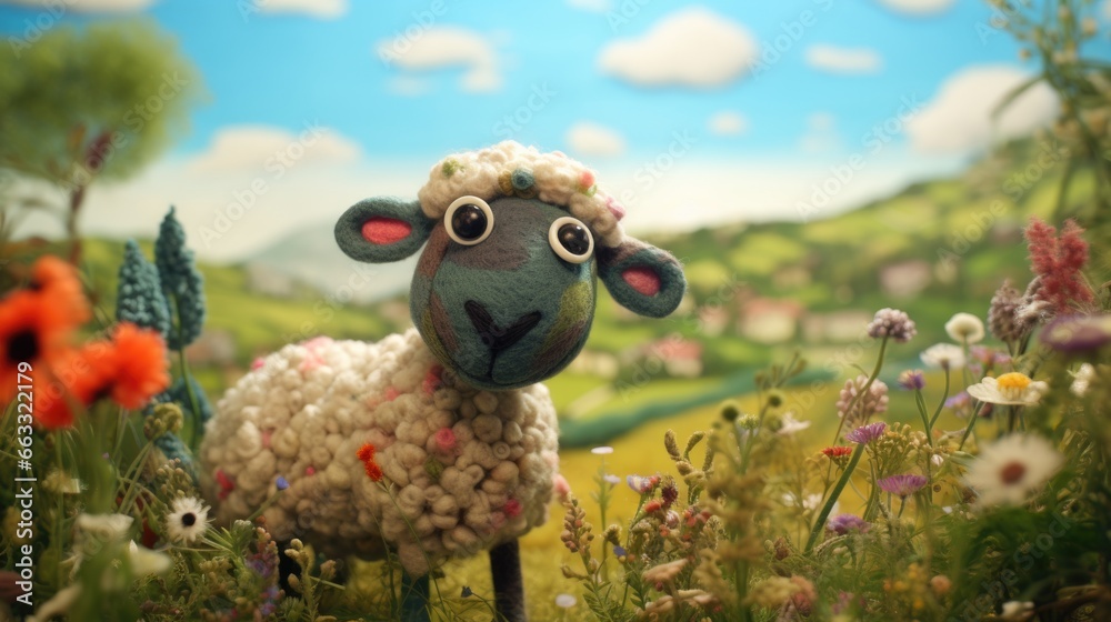 Super duper cute sheep toy in a spring season flower meadow on a green grass hill, made from fluffy and cuddly wool felt, wholesome pastoral cartoon cuteness. #663322179