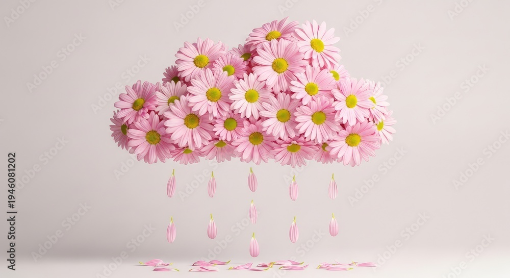 Surreal Concept of a Cloud Formed by Pink Daisies Raining Petals, Creative Minimalist Floral 3D Render #1946081202