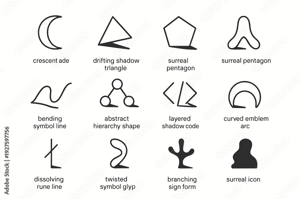 Surreal Shadow Motifs Grid. Surreal symbolic shadow motifs. Line outline icon set of Surreal symbolic shadow #1927597756