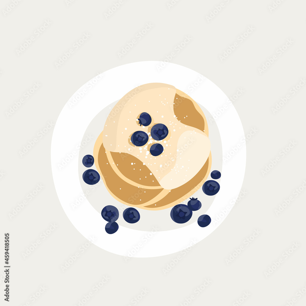 Sweet classic breakfast with pancakes. top view vector illustration. Pancakes with condensed milk and berries. Plate with a beautiful breakfast. #459418505
