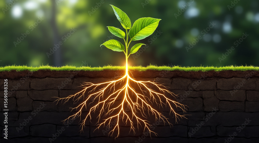 Synthetic Biology concept ,Young green plant with glowing root system underground in soil with grass and blurred background #1569088326