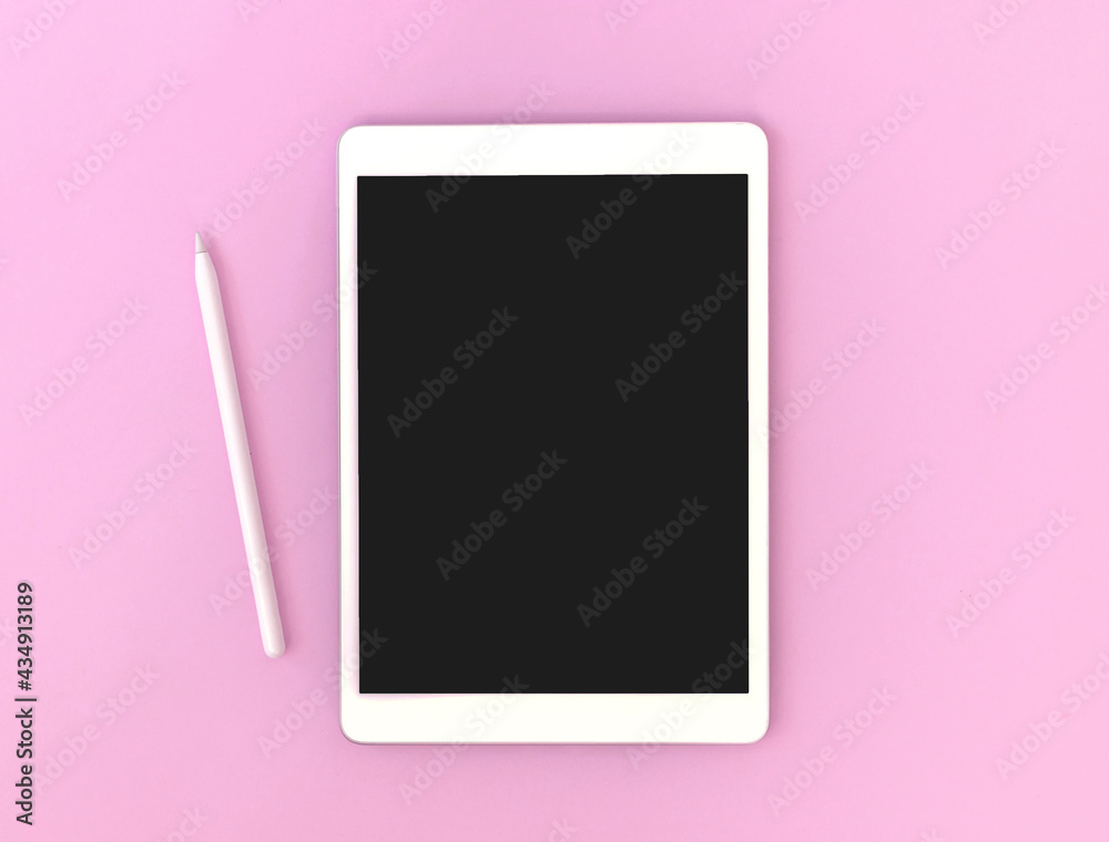 Tablet mockup screen with stylus pencil for drawing and artist, colorful pink background, copy space photo #434913189