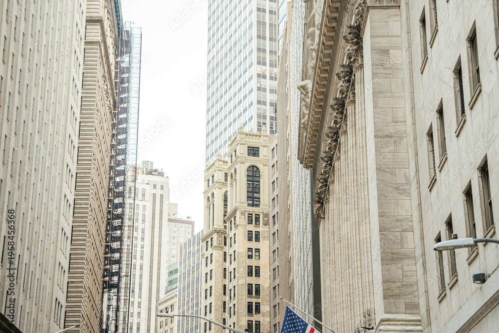 Tall skyscrapers and classic financial architecture rise above Wall Street in New York City. The financial district showcases corporate buildings, investment offices, and urban city infrastructure. #1958456368