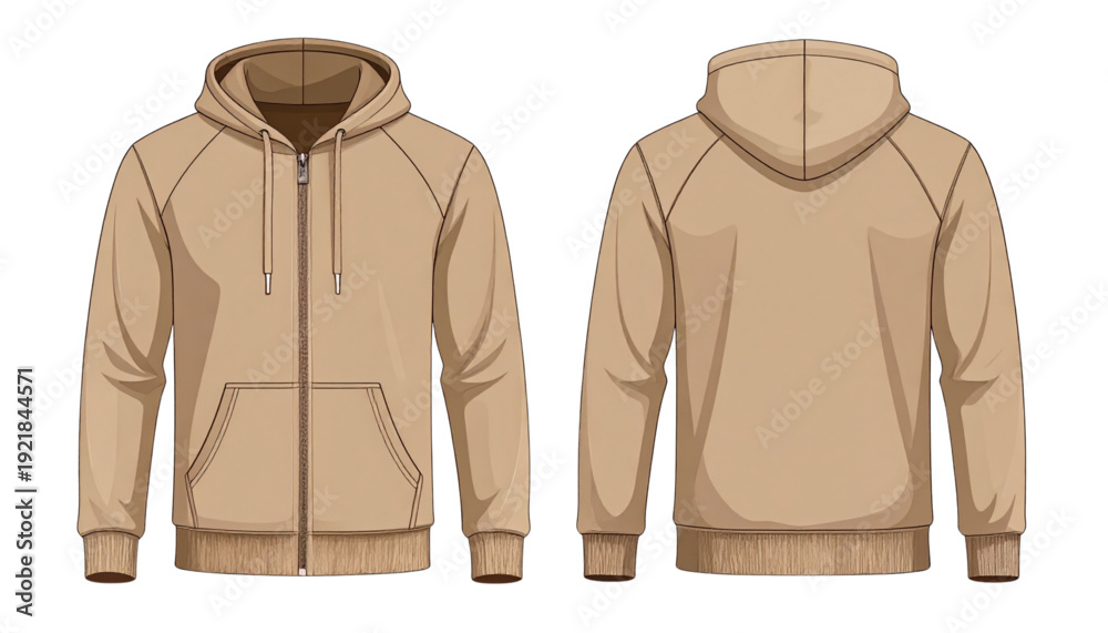 Tan quilted jacket with front pockets and hood displayed from front and back views. isolated on transparent background #1921844571