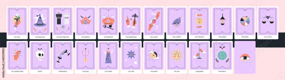 Tarot cards deck. Major arcana set. Hand drawn vector illustration. #685599815