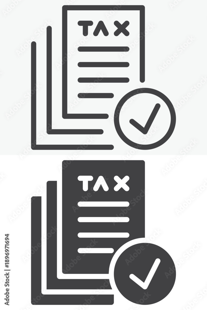 Tax documents with checkmark icon set in different style. Line and outline with solid version, editable stroke vector icon sign and symbol. Verified tax paperwork icon. #1896971694