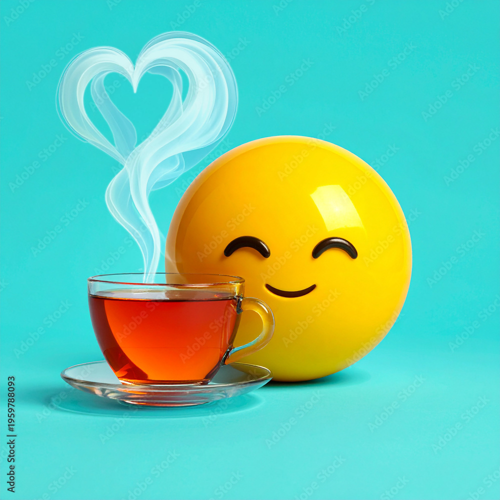 Tea in a transparent cup next to a cute smiling 3d emoji, smiley, emoticon, face with eyes closed, heart shaped steam, aqua background. #1959788093