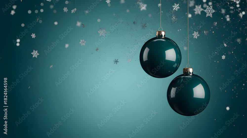 Teal christmas ornaments hang against a shimmering bluegreen background, with falling snowflakes and sparkling glitter, creating a festive winter holiday design #1824164598