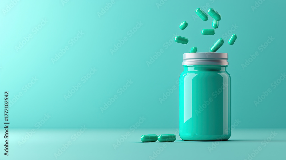 Teal medicine bottle with floating capsules and minimal background conveying wellness and modern pharmaceutical concept, clean composition and soft lighting evokes calm and trust #1772102542
