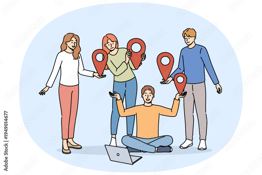 Team of students uses online communication on network, standing near laptop and holding red geotags in hands. Online communication technology for educational or professional purposes #1949014677