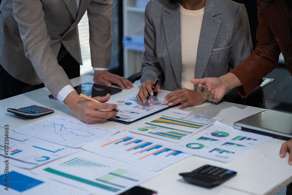 Teamwork process, Business team using a calculator to calculate the numbers of statistic business profits growth rate on documents graph data, desk in the office. #1772314663