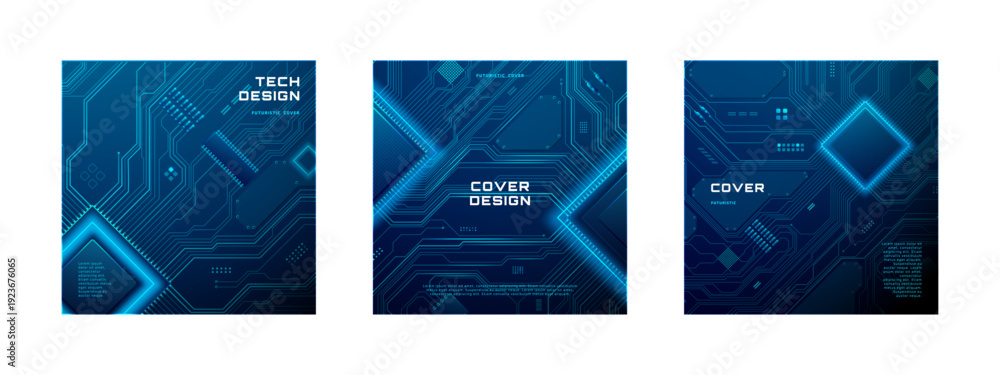 Tech background set with glowing circuit patterns and blue digital waves. AI chip or semiconductor. Modern template for social media posts, banners, and corporate presentations. Vector illustration #1923676065