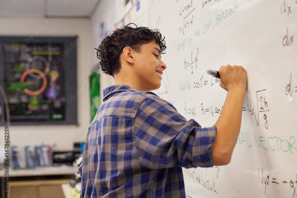 Teen student writing equation on whiteboard in classroom #1678612259