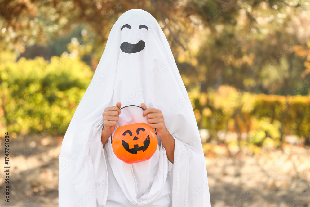 Teenage boy dressed as ghost for Halloween in park #1747761684