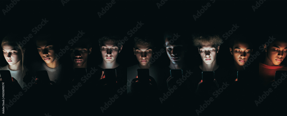 Teenagers staring at smartphones in darkness with screen glow. Social media addiction and digital dependence among youth #1630699574