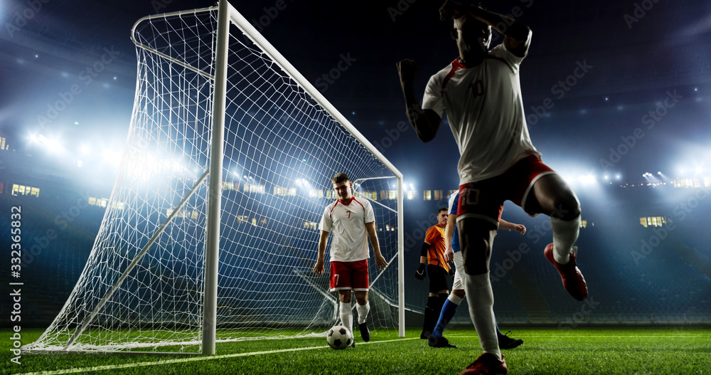 Tense game moment in front of the goal on the empty professional soccer stadium. No spectators on tribunes. Stadium is made in 3d. #332365832