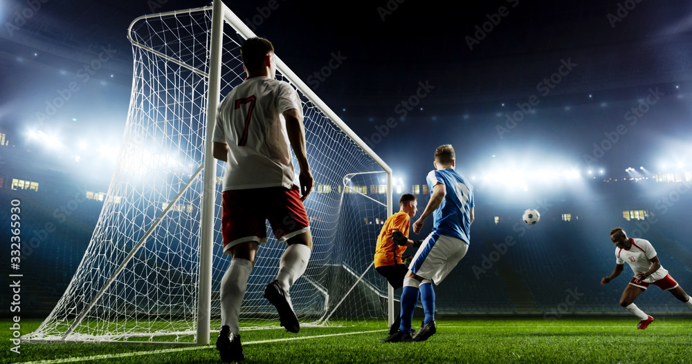 Tense game moment in front of the goal on the empty professional soccer stadium. No spectators on tribunes. Stadium is made in 3d. #332365930