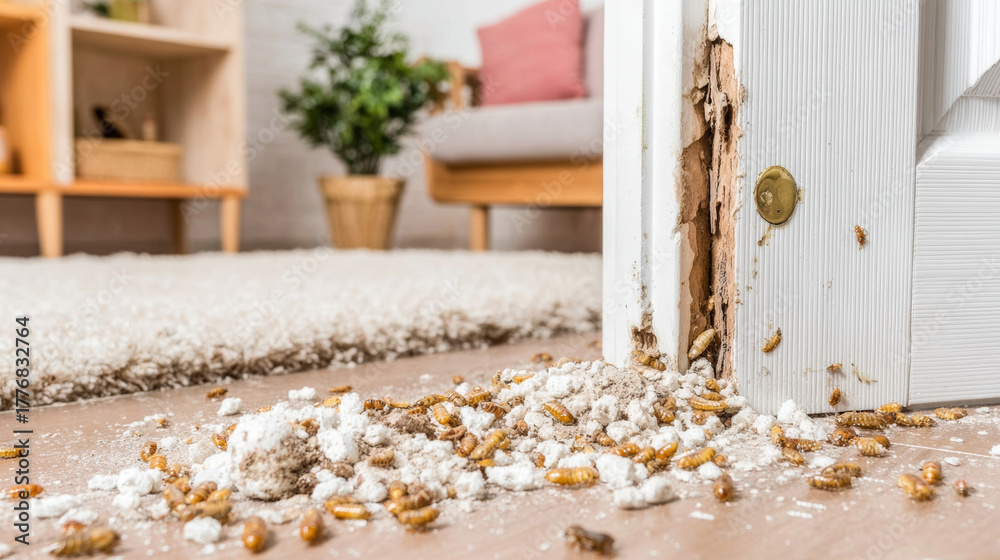 Termite larvae and chewed wood particles littering a floor, indicating a pest infestation problem in a residential setting #1776832764