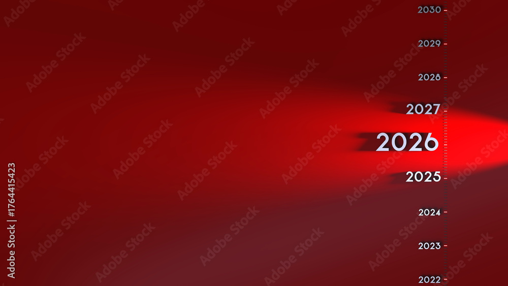 texte 2026 dans une frise chronologique éclairé par un spot de lumière - rendu 3D sur fond rouge #1764415423