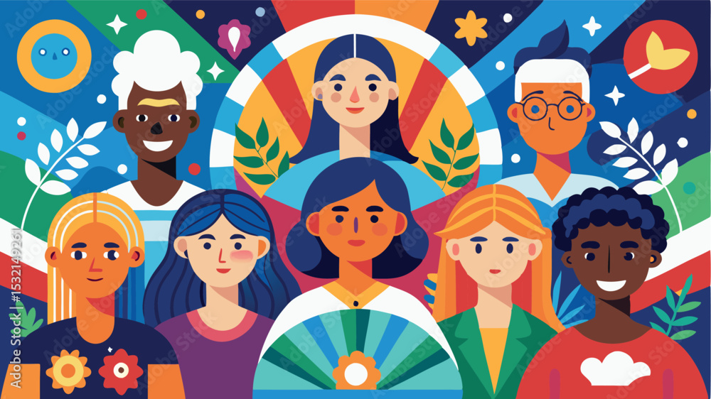 The composition conveys a sense of unity, mutual respect and acceptance of people's differences. The image symbolizes diversity and inclusiveness through contrasting colors and bold shapes. #1532149261