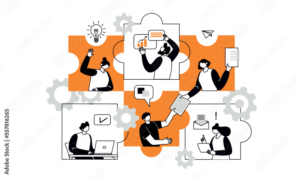The concept of joint teamwork, building a business team. Vector illustration of working characters, people connecting pieces of puzzles. Metaphor of cooperation and business partnership. #557816265