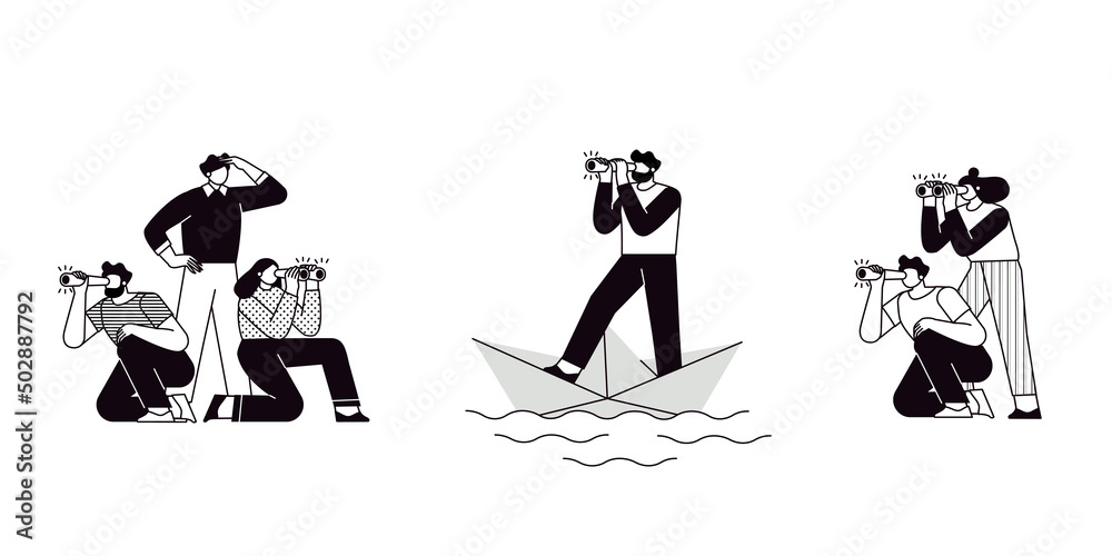 The concept of searching for opportunities, solutions, new business ideas. People looking to the future, choosing the direction of development. Characters looking through spyglasses. #502887792