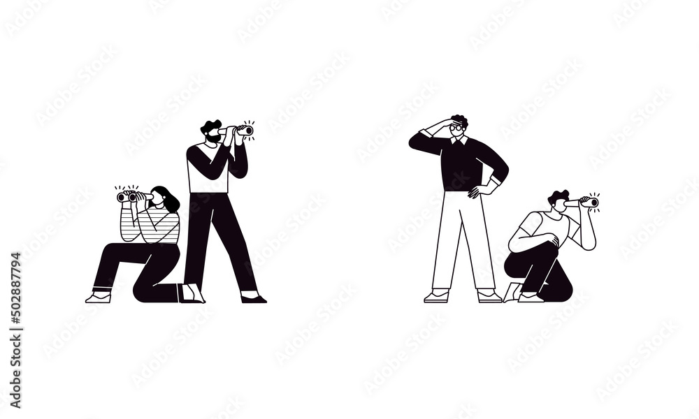 The concept of searching for opportunities, solutions, new business ideas. People looking to the future, choosing the direction of development. Characters looking through spyglasses. #502887794