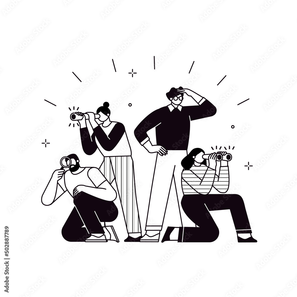 The concept of searching for opportunities, solutions, new business ideas. People looking to the future, choosing the direction of development. The characters is searching, looking around. #502887789