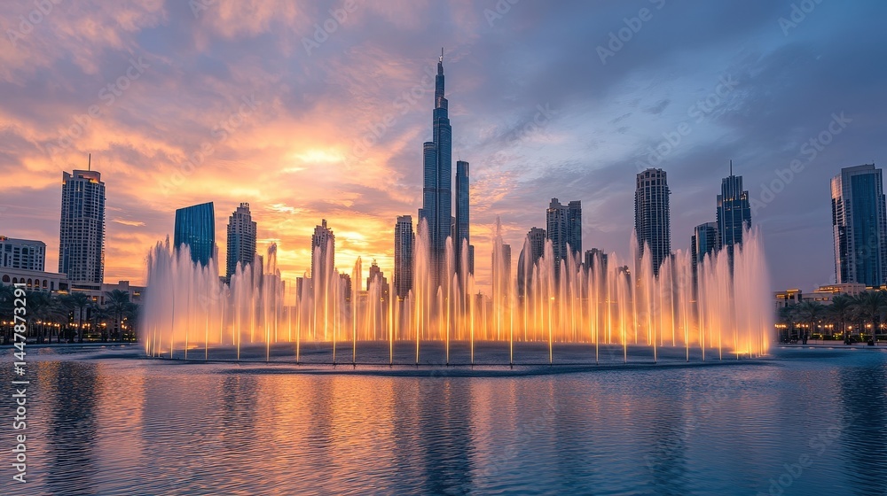 the Dubai Fountain, with water jets dancing harmoniously against a twilight sky. #1447873291