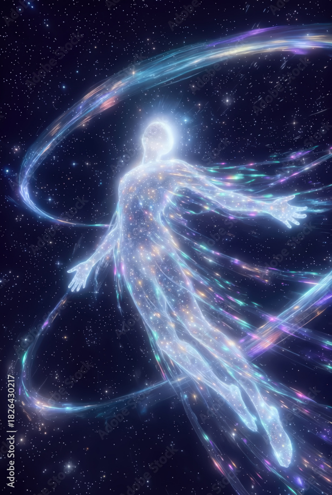 the generated art. A human figure made of threads of energies and luminous particles shines against the background of space #1826430217