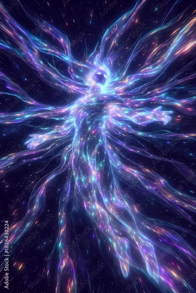 the generated art. A human figure made of threads of energies and luminous particles shines against the background of space #1826430224