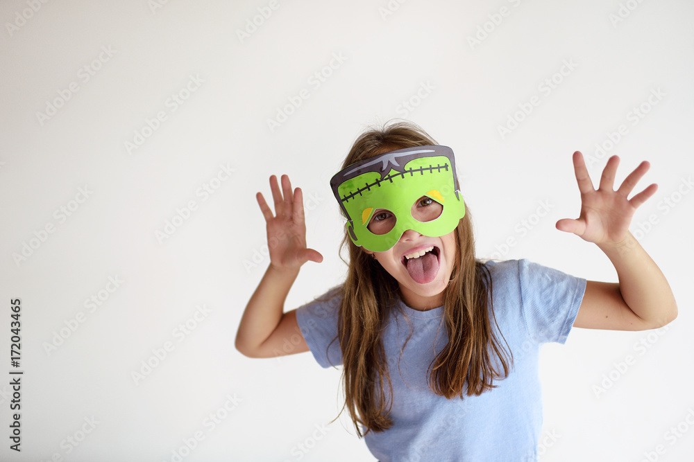 The girl plays in a self-made mask of Frankenstein #172043465