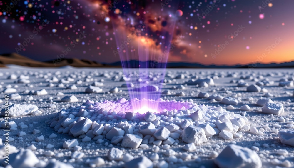 The image depicts a vast, icy landscape with a central glowing phenomenon emerging from a circular formation of jagged ice chunks #1948820447
