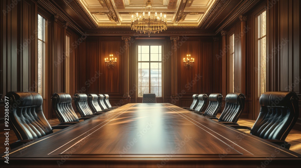The interior of a government boardroom with a large conference table, high-back chairs, #923080677