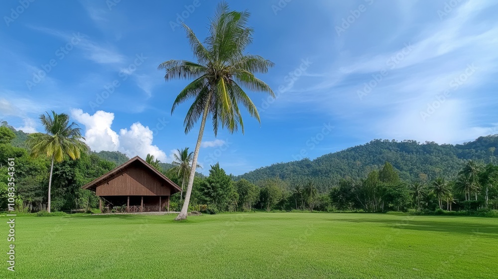 The natural scenery the palm and the sky are very interesting or pemandangan alam petak sawah di wilayah Nanggulan Kulonprogo #1083354361