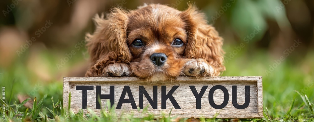 The Puppy Holding a Thank You Sign Lying on Grass in Garden #1881813485