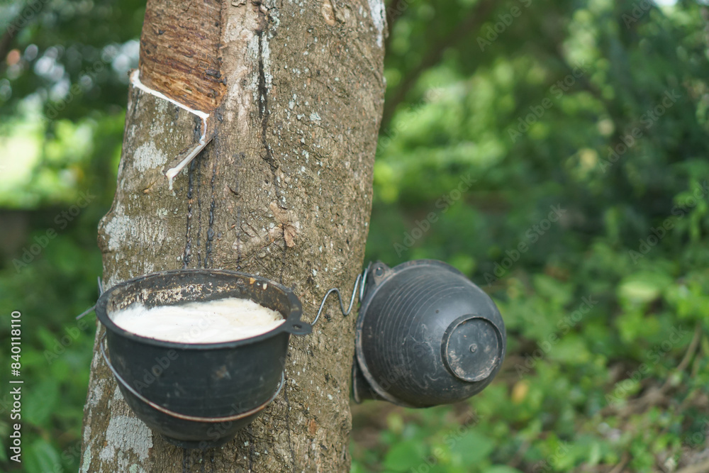 The rubber tree that was tapped Latex that is flowing down in the supporting container #840118110