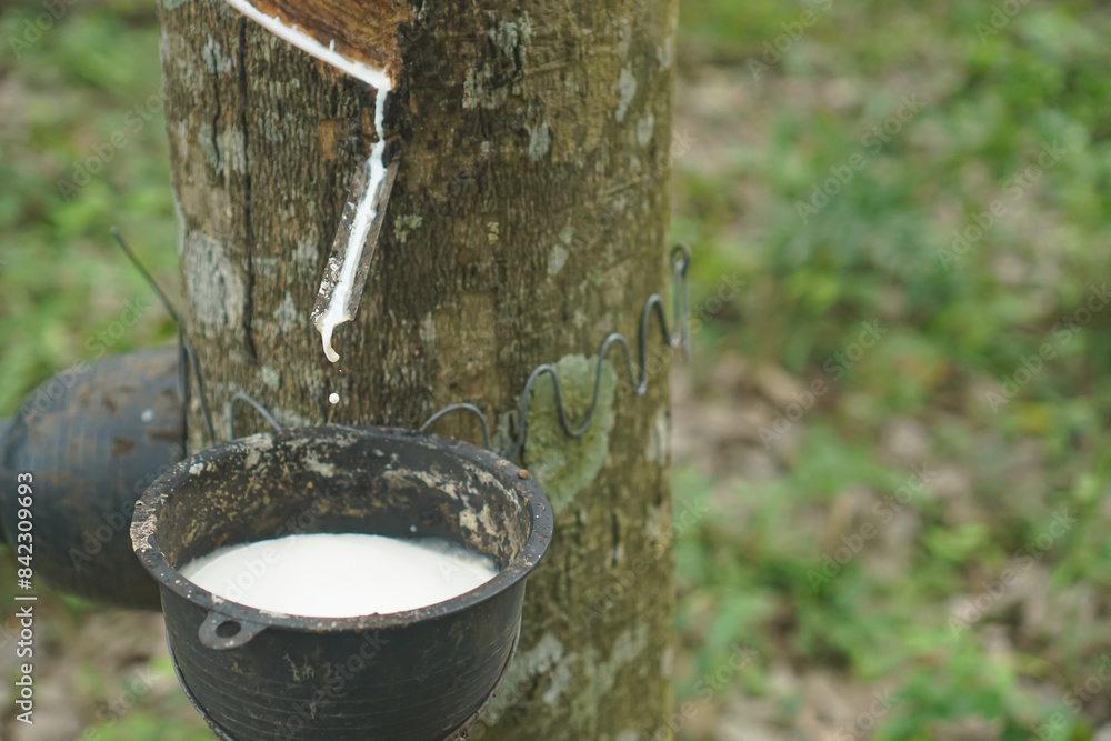 The rubber tree that was tapped Latex that is flowing down in the supporting container #842309693