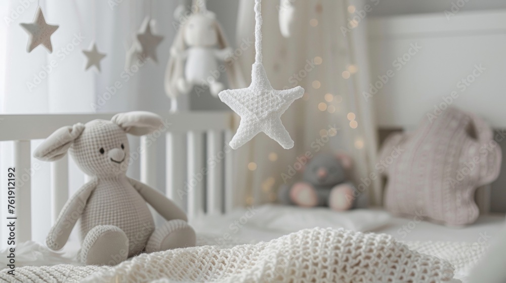 The serene and peaceful nursery room is filled with cuddly stuffed animals soft blankets and delicate mobiles creating a cozy and dreamy atmosphere for newborns to rest and #761912192