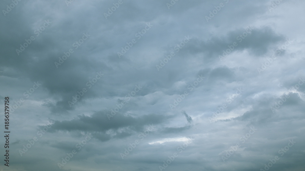 The sky is overcast and filled with moody grey clouds, creating a dramatic and soothing atmosphere #1856379758