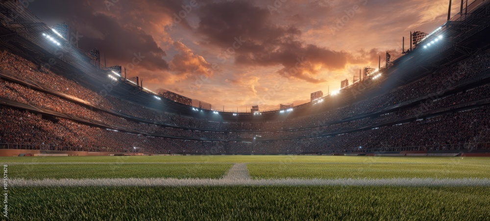 The Stadium at Sunset Filled with Fans and Dramatic Floodlit Sky #1875571678