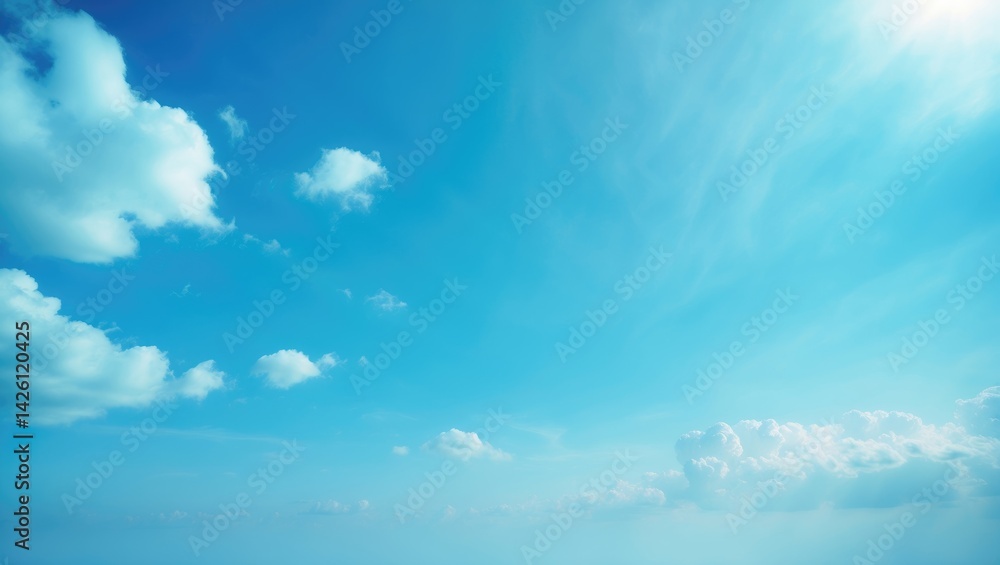 The tranquil bright blue sky features gentle white clouds drifting peacefully under soft sunlight, creating a calming and refreshing ambiance. #1426120425