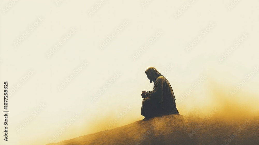 The Trial of the Savior. Jesus fasting and praying in the desert for 40 days. Jesus sits alone in the barren desert, deep in prayer. #1077298625