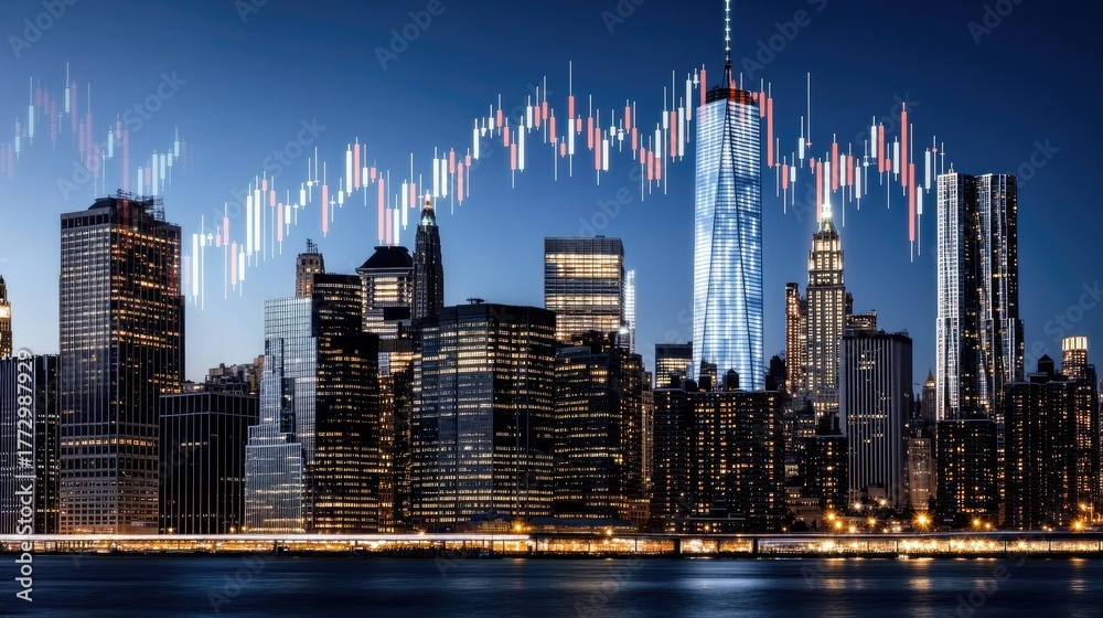 The vibrant skyline of City is illuminated at night, showcasing a blue candlestick chart that represents stock market activity #1772987929